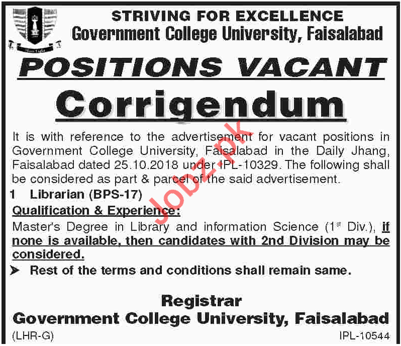 Vacancies in Government College University Faisalabad Advertisement November 2018