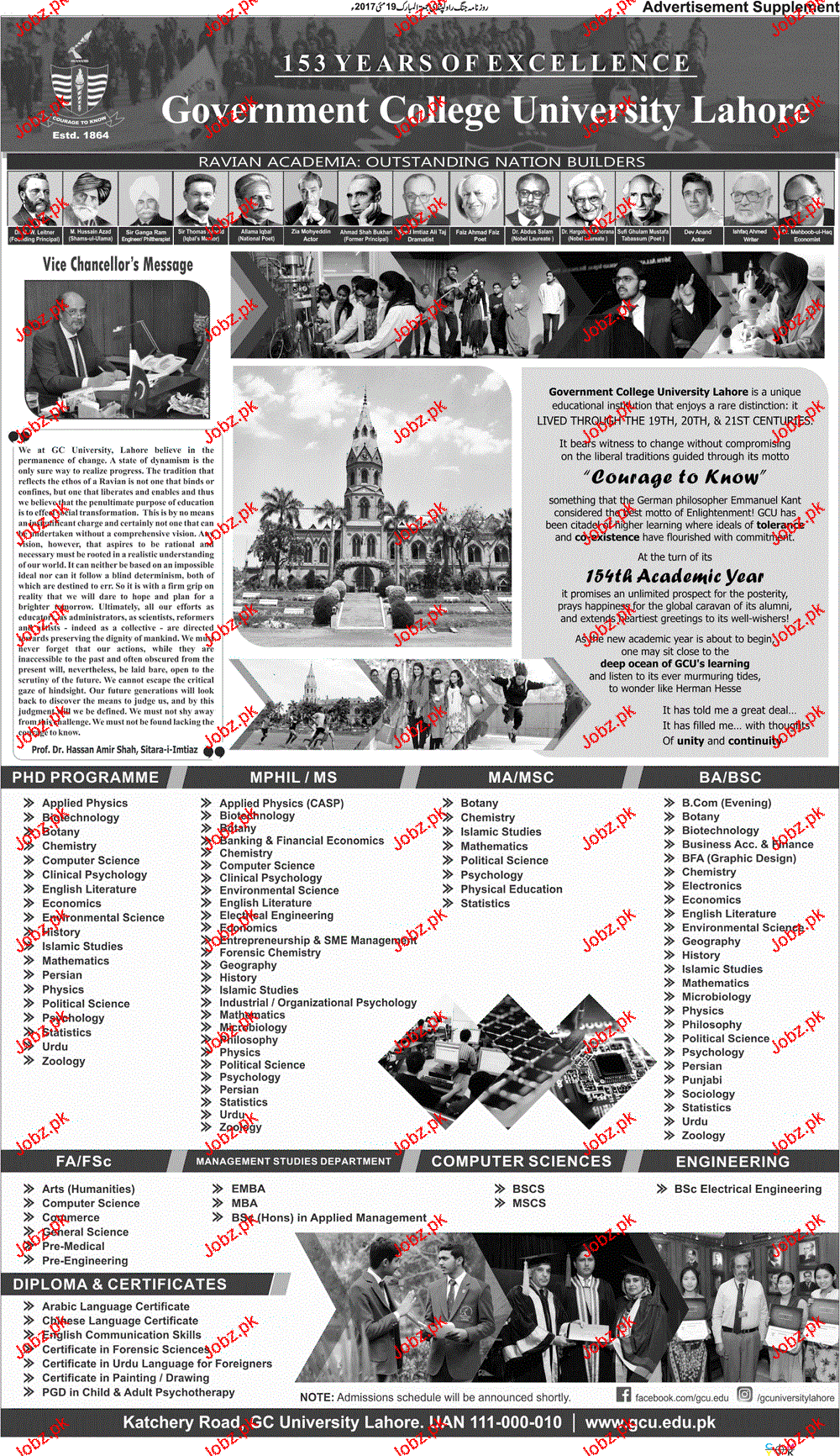Government College University Lahore Admission in BA, BSc, MA, MSc, MS / Mphill and Phd in Lahore. Read newspaper ad for exact details.