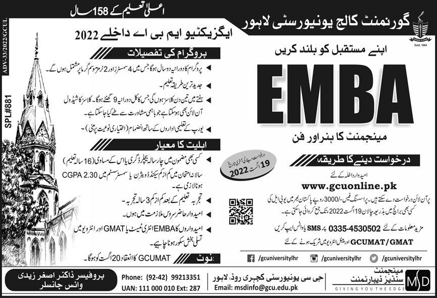 Government College University Lahore EMBA Admissions 2022