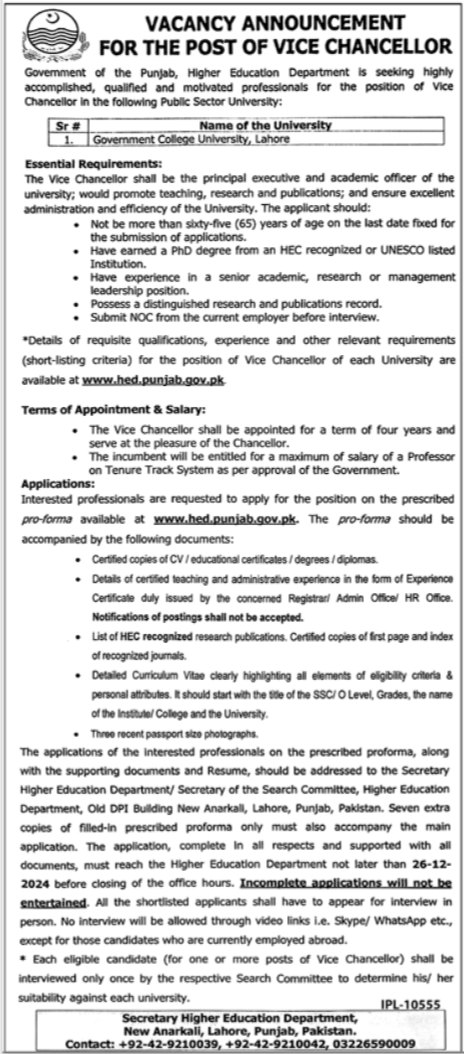 Higher Education Department Lahore, lahore Punjab Pakistan invites applications from eligible candidates for the post of vice chancellor as per advertisement of December 12, 2024 published in daily Jang Newspaper. Educational qualifications required Phd etc.