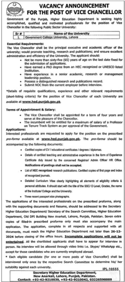 Higher Education Department Lahore, lahore Punjab Pakistan invites applications from eligible candidates for the post of vice chancellor as per advertisement of December 12, 2024 published in daily The News Newspaper. Phd etc. educational qualification will be preferred.