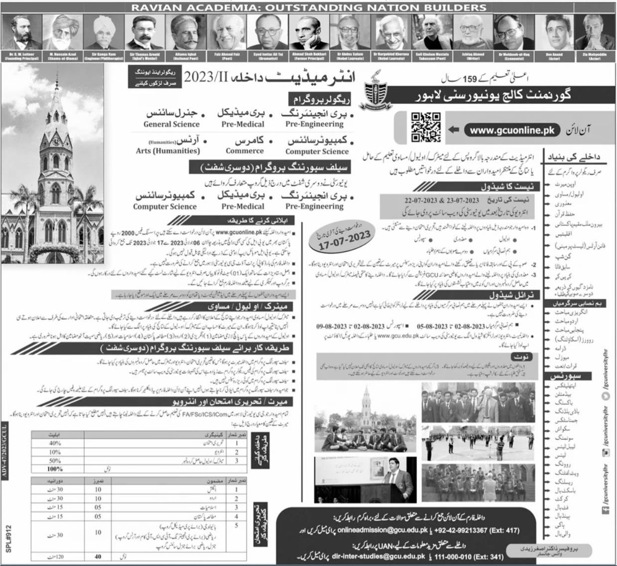 Government College University Intermediate Part I, Fsc Pre Engineering, FSc Pre Medical, FA General Science, FA Arts, ICS Computer Science, I.Com admissions 2023 has been announced. Students who want to take admissions in Government College University Lahore Punjab Pakistan for academic year 2023 to continue education in Science University can apply. Students who want to enroll for academic session 2023 in ICS, I.com and Intermediate qualification and admission criteria for Government institute can apply till last date 17 July 2023. Read newspaper ad for exact details.