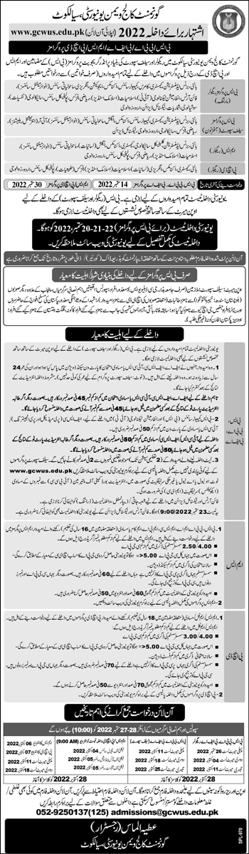 Government College Women University Sialkot BS MS PhD Admissions 2022