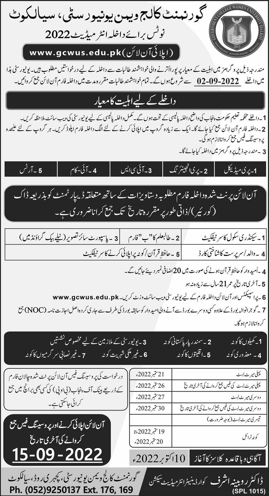 Government College Women University Sialkot GCWU Faculty of Science in Pre-Medical Pre-Engineering, ICS, I.Com, Arts. admissions 2022 has been announced. Students who want to take admissions in Government College Women University Sialkot GCWU Sialkot Punjab Pakistan for academic year 2022 to continue education in Teaching University can apply. Students who want to enroll for academic session 2022 in I.com, Intermediate and ICS qualification and admission criteria for Government institute can apply till last date 15 September 2022. Read newspaper ad for exact details.