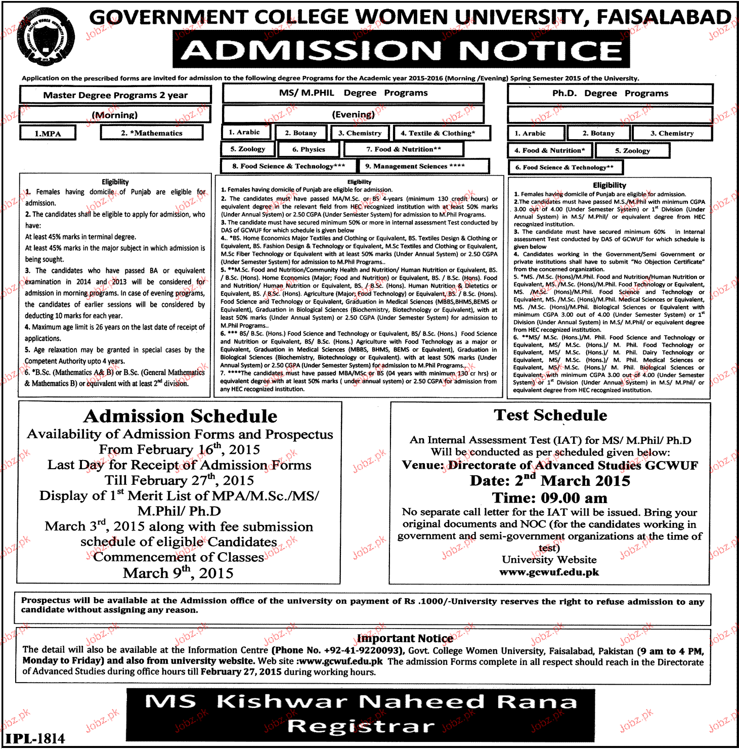 Government CollegeWomen University Admission in MA, MS, MS and Phd in Faisalabad. Read newspaper ad for exact details.