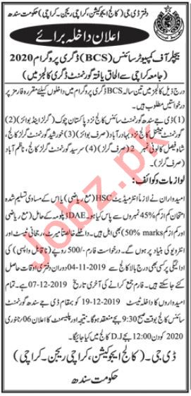College Education Department, Government of Sindh has announced admissions in Bachelor of Computer Science B.Sc degree program 2010 in Government Degree Colleges Karachi. All degree colleges are affiliated with University of Karachi. Read newspaper ad for exact details.