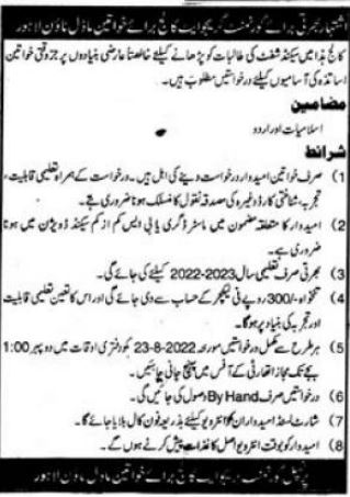 Government Degree College for Women Lahore, lahore Punjab Pakistan invites applications from eligible candidates for the post of lecturer urdu and islamaiat lecturer as per advertisement of August 20, 2022 published in daily Daily Pakistan Newspaper. Persons with M.sc, Bachelor and Master etc. education can apply.