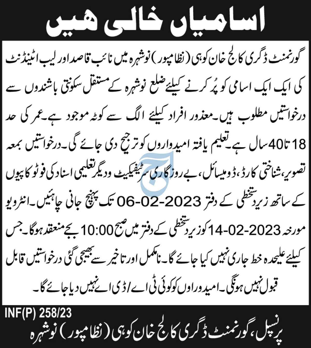 Government Degree College jobs advertisement dated about 19 January 2023 in daily Aaj Newspaper invites application for the vacant post of naib qasid and lab attendant in Nowshera, nowshera Khyber Pakhtunkhwa KPK Pakistan. Persons with Intermediate, Middle and Matric etc. education can apply.