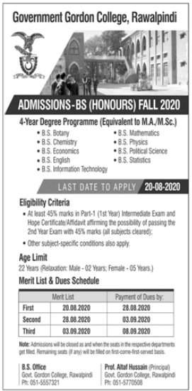 Government Gordon College has announced admissions for 4 Year Degree Programme BS Botany, BS Mathematics, BS Chemistry, BS Physics, BS Economics, BS Political Science, BS English, BS Statistics and BS Information Technology. Read newspaper ad for exact details.