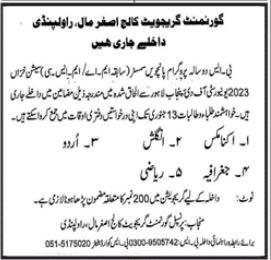 Government Graduate College Asghar Mall has announced admissions 2024 for 2 Years BS Programs. Students who want to take admissions in Government Graduate College Asghar Mall Rawalpindi Punjab Pakistan for academic year 2024 to continue education in Science University can apply. Eligible candidates for admissions in BS can apply as per Government institute criteria and before closing date 13 January 2024 after reading advertisement online. Read newspaper ad for exact details.