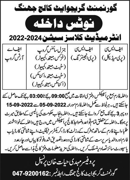 Government Graduate College Jhang Intermediate Admissions 2022 24