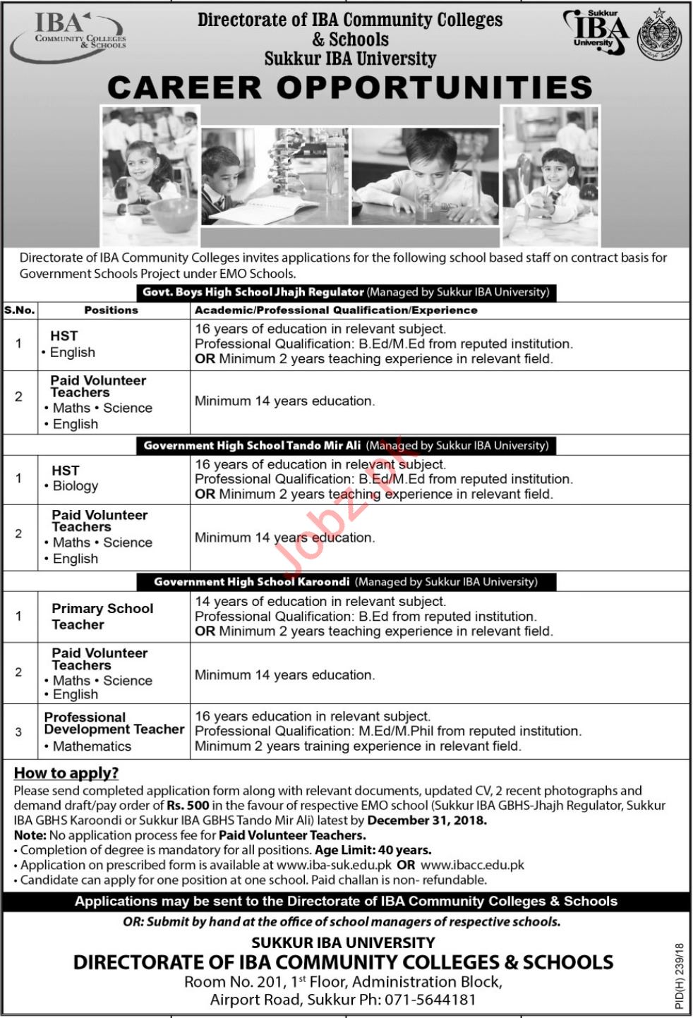 Directorate of IBA Community Colleges & Schools Sukkur IBA University is seeking applications from highly qualified candidates for the posts of English Teacher, Maths Teacher, Science Teacher, Biology Teacher, Mathematics Teacher for Government High Schools in Sukkur.