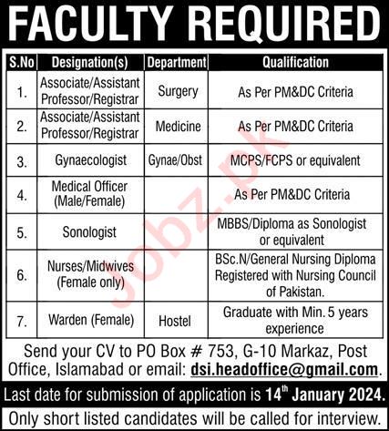 Vacant posts including nurse, assistant professor, warden, midwives, registrar, sonologist, associate professor, gynaecologist and medical officer are announced in Government Institute Islamabad, islamabad Islamabad Pakistan as per 7 January 2024 advertisement in daily Express Newspaper. Educational qualifications required Mphil, Master, Phd, Bachelor and MBBS etc.