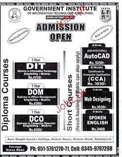 Government Institute of Information Technology Admission in DIploma in Rawlapindi. Read newspaper ad for exact details.