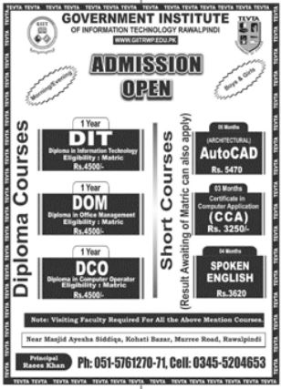 Government Institute of Information Technology has announced admissions for Diploma Courses & Short Courses in DIT, DOM, DCO, Auto CAD, CCA & Spoken English in Rawalpindi. Read newspaper ad for exact details.