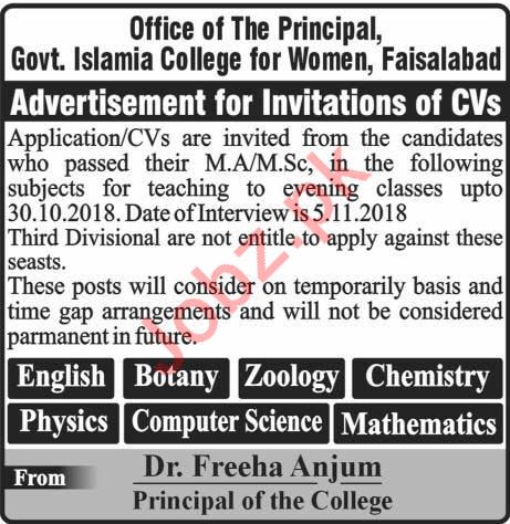 Government Islamia College for Women requires the services of experienced and dedicated candidates for the posts of English Lecturer, Botany Lecturer, Zoology Lecturer, Chemistry Lecturer, Physics Lecturer, Computer Science Lecturer, Mathematics Lecturer in Faisalabad.