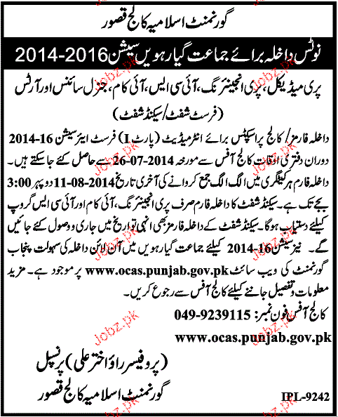 Government Islamia College Kasur Admission in Class XI in Kasur. Read newspaper ad for exact details.