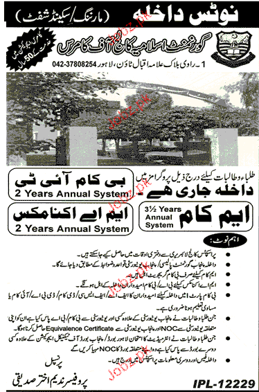 Government Islamia College of Commerce Admission in B.Com and M.COm in Lahore. Read newspaper ad for exact details.