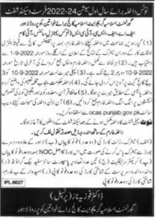 Government Islamia Graduate College for Women Intermediate Admissions 2022