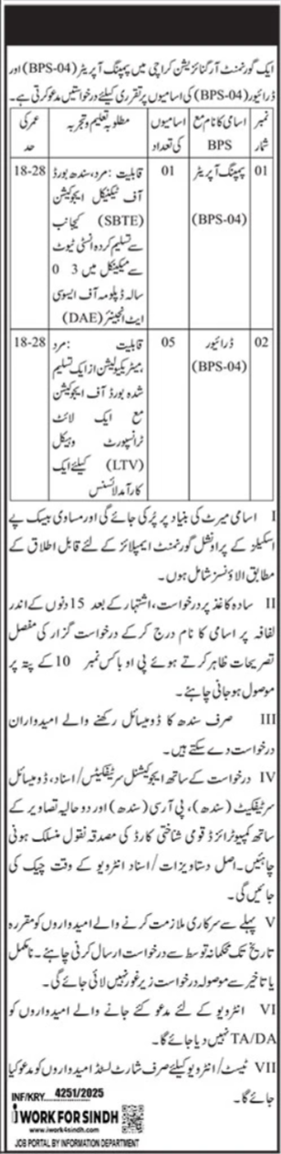 Government Organization jobs advertisement dated about 16 December 2025 in daily Jang Newspaper invites application for the vacant post of driver and pumping operator in Karachi, karachi Sindh Pakistan. Middle, Matric and Intermediate etc. educational qualification will be preferred.