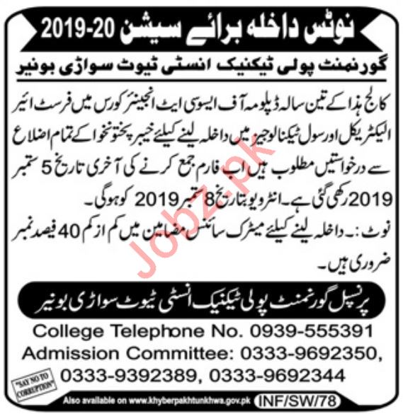 Government Poly technical Institute has announced the admissions in Diploma of Associate Engineering DAE in Electrical and Civil Technologies in Sawari Buner, kPK. Read newspaper ad for exact details.