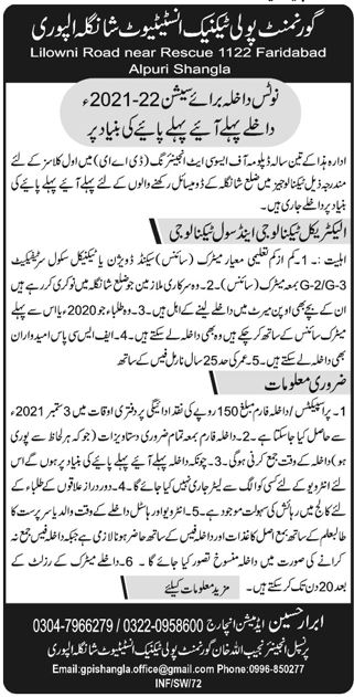 Government Poly Technical Institute has announced admissions for Diploma of Associate Engineering DAE in Electrical Technology & Civil Technology in Shangla KPK 2021. Read newspaper ad for exact details.