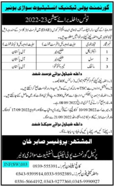 Government Polytechnic Institute Diploma of Associate Engineering Electrical, Civil, Mining. admissions 2022 has been announced. Eligible students can apply for academic admissions 2022 in Government Polytechnic Institute Buner Khyber Pakhtunkhwa KPK Pakistan for Technical Diploma. Eligible students for fulfilling criteria for admissions in DAE can enroll as per Government admission policy 2022 till closing date 8 September 2022. Read newspaper ad for exact details.