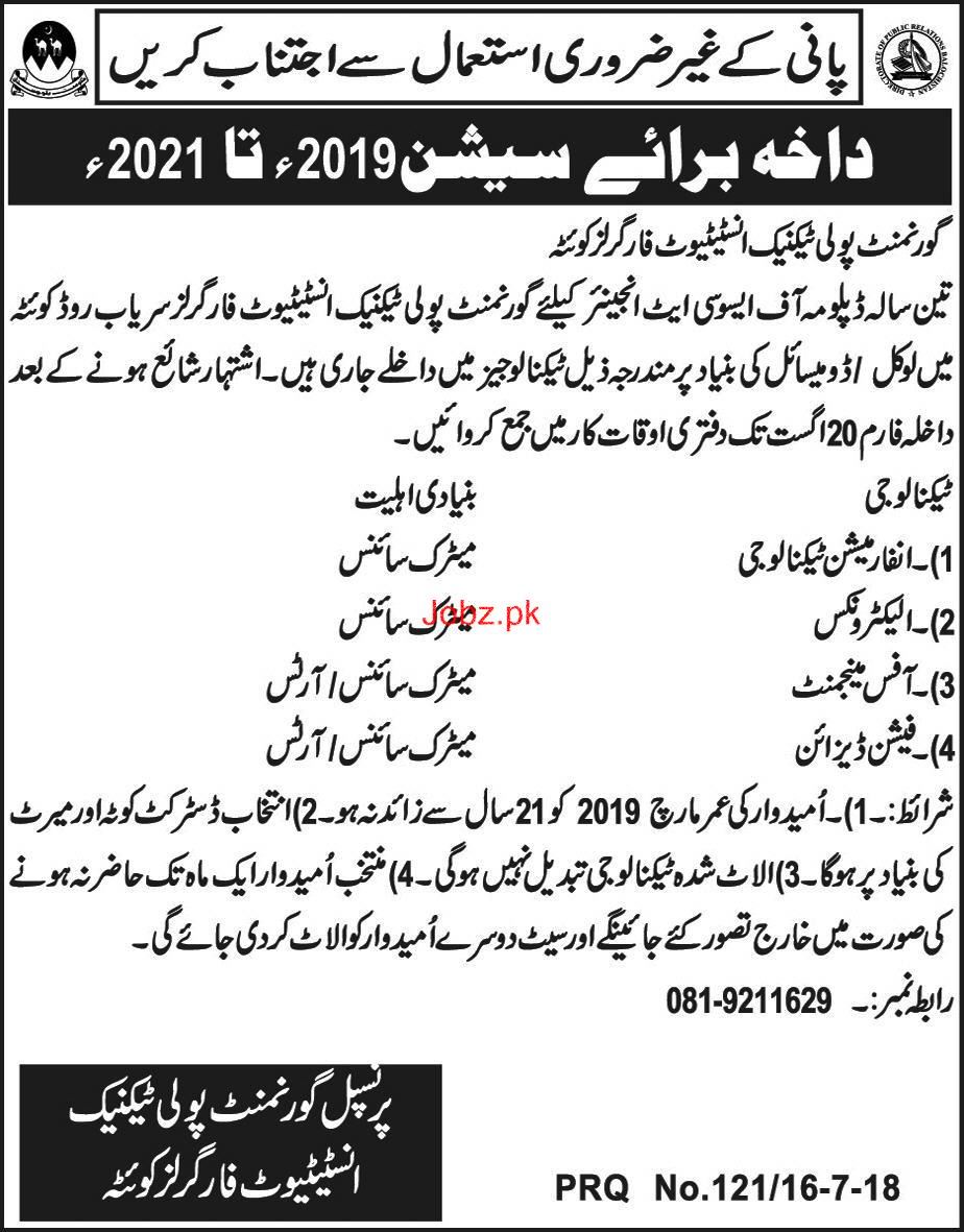 Government Polytechnic Institute For Girls Quetta Admission in Diploma of Associate Engineers DAE in Technology, Electronics, Office Management in Quetta. Read newspaper ad for exact details.