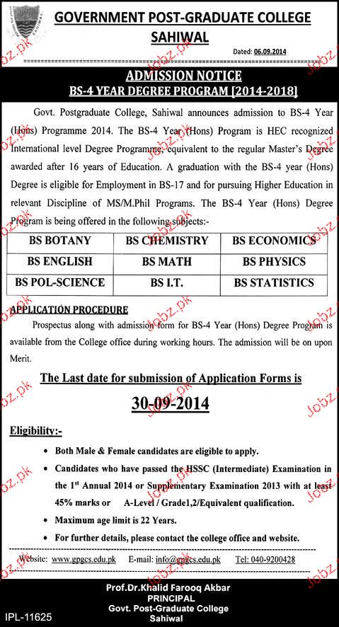 Government Postgraduate College Admission in BS in sahiwal Read newspaper ad for exact details.