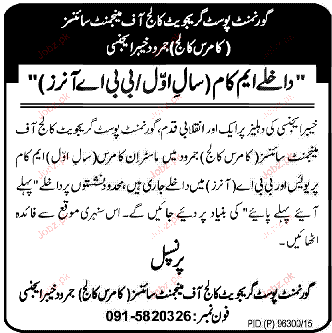 Government Postgraduate College of Management Sciences Admission in BBA in Khyber Agency. Read newspaper ad for exact details.