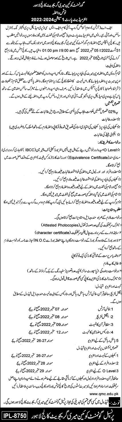 Government Queen Merry Graduate College Lahore Intermediate Admissions 2022 24