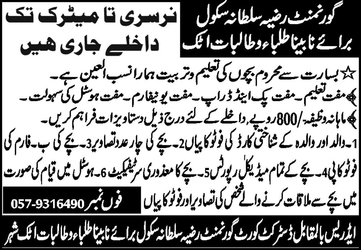 Government Razia Sultana School invites applications for admissions in Nursery, Class I, Class II, Class III, Class IV, Class V, Class VI, Class VII, Class VIII, Class IX and Matric. Read newspaper ad for exact details.