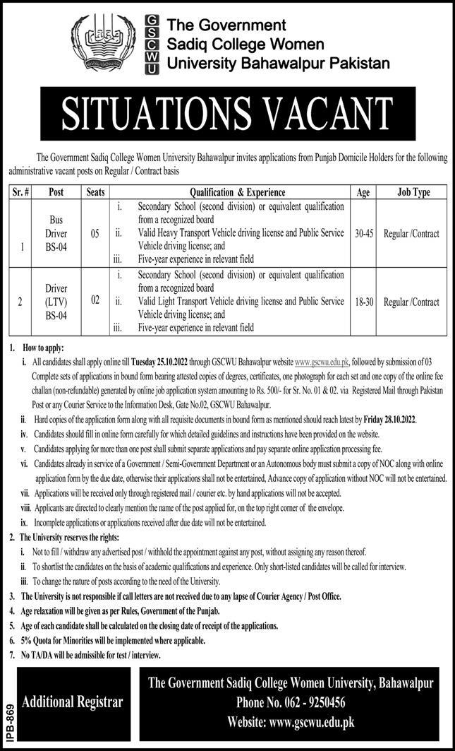 Latest The Government Sadiq College Women University Driving Posts Bahawalpur 2025