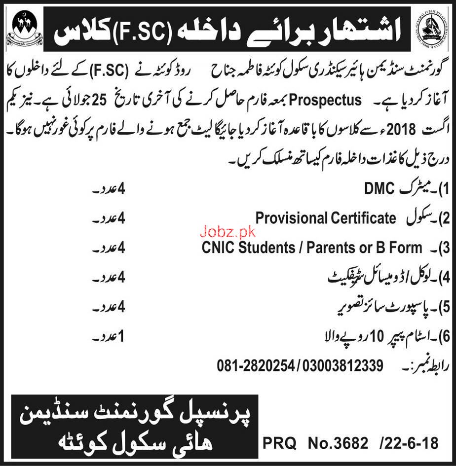Government Sandimen High School Quetta Admission in FSc Pre Medical, Pre Engineering and Computer Sciences in Fatima Jinnah Road Quetta. Deadline for Submission of Admission form 25-07- 2018. Read newspaper ad for exact details.