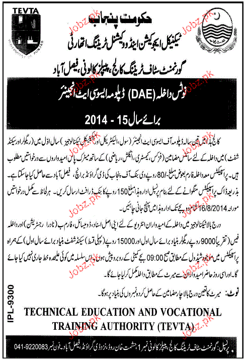 Government Staff Training College Admission in DAE in Faisalabad. Read newspaper ad for exact details.