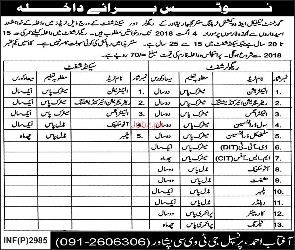 Government Technical and Vocational Training Center Gul Bahar Peshawar Admission in Technical Courses Electricians, Civil Draftsmen Auto Mechanics, Welders, Plumbers in Peshawar. Read newspaper ad for exact details.