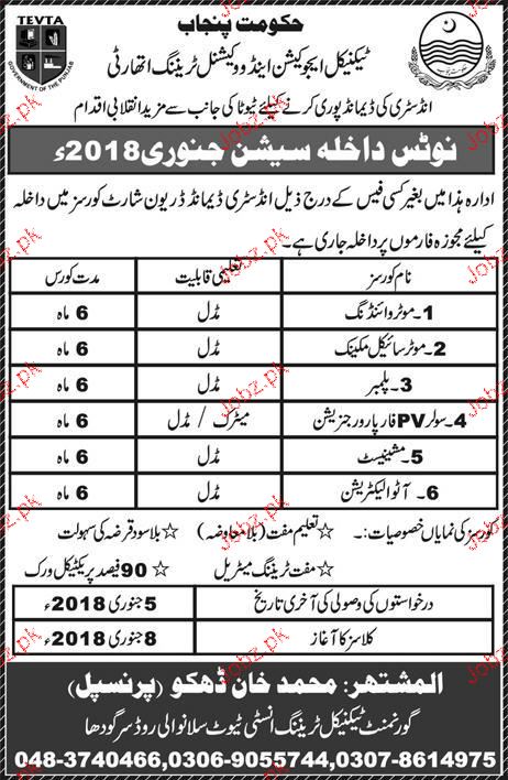 Government Technical Training Institute Admission in Courses in Motor Winding, Plumbers, Solor PV Power Generation, Machinists and Auto Electricians Sargodha. Read newspaper ad for exact details.