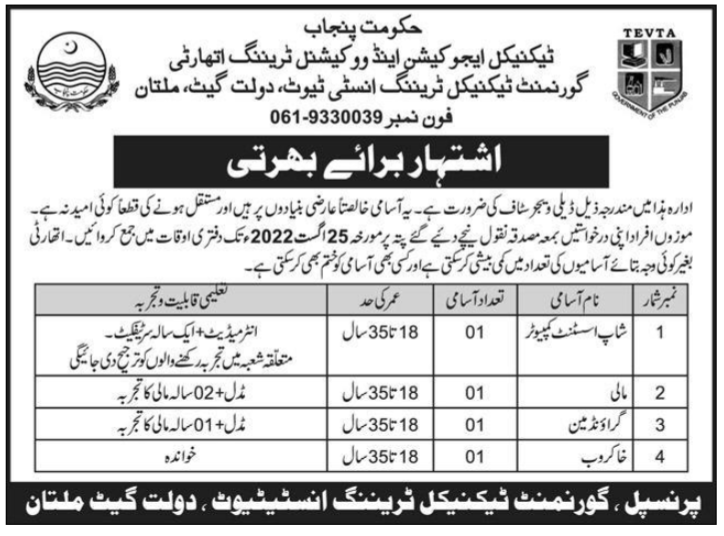 Technical Education & Vocational Training Authority TEVTA, Government Technical Training Institute invites applications for job positions advertised in daily Express dated 7 August 2022 for following vacancies in Multan, multan Punjab Pakistan.