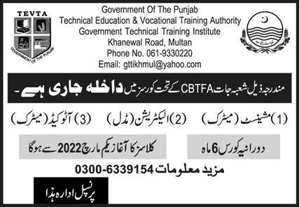 Government Technical Training Institute Multan, Technical Education & Vocational Training Authority TEVTA has announced admissions 2022 for Machinist, Electrician, AutoCAD. Students can enroll for admissions in Technical Education & Vocational Training Authority TEVTA Multan Punjab Pakistan for academic year 2022 to continue campus based or online education in Teaching Course. Eligible students for fulfilling criteria for admissions in Course can enroll as per Government admission policy 2022 till closing date 1 March 2022. Read newspaper ad for exact details.