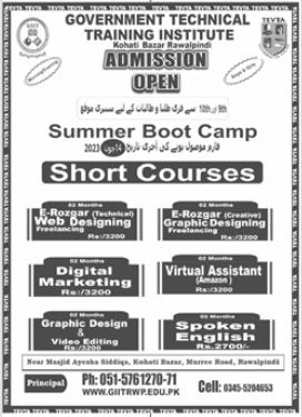 Admissions in Government Technical Training Institute 2023 for Web Designing, Graphic Designing, Digital Marketing, Virtual Assistant, Graphic Design, Spoken English has been announced. Government Technical Training Institute Rawalpindi Punjab Pakistan welcomes students to apply for admissions in academic year 2023 in Management College. Eligible candidates for admissions in Course can apply as per Government institute criteria and before closing date 4 July 2023 after reading advertisement online. Read newspaper ad for exact details.