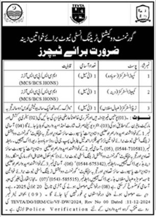 Government Vocational Training Institute for Women invites applications for job positions advertised in daily Jang dated 3 July 2025 for following vacancies in Dina, dina Punjab Pakistan.