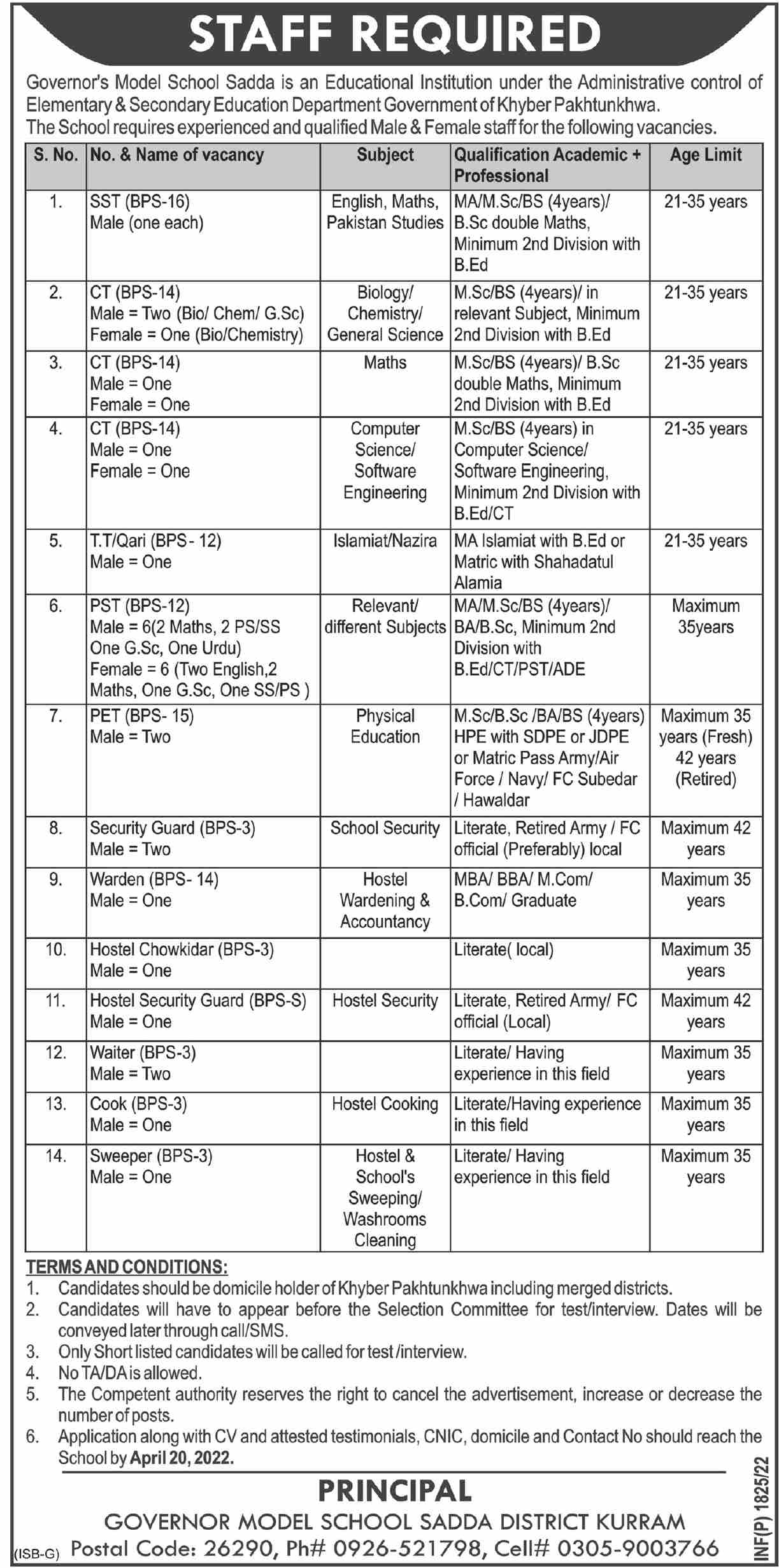 Governor Model School & College Kurram, kurram Khyber Pakhtunkhwa KPK Pakistan invites applications from eligible candidates for the post of tt, sweeper, sst, pet, hostel chowkidar, cook, ct, warden, waiter and security guard as per advertisement of April 2, 2022 published in daily Dawn Newspaper. Matric, Master, Bachelor, Middle and Intermediate etc. educational qualification will be preferred.