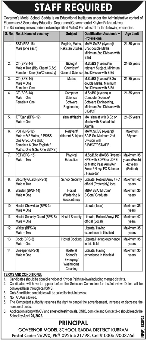 Vacant posts including waiter, sweeper, tt, hostel chowkidar, warden, sst, pet, cook, security guard and ct are announced in Governor Model School & College Kurram, kurram Khyber Pakhtunkhwa KPK Pakistan as per 2 April 2022 advertisement in daily Aaj Newspaper. Preferred Education is Master, Bachelor, Matric, Middle and Intermediate etc.