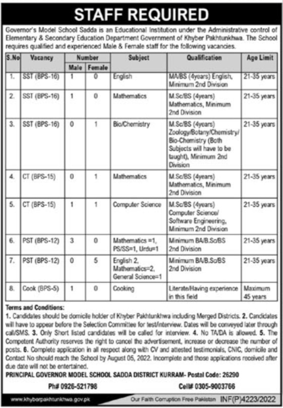 Governor Model School Sadda, Elementary and Secondary Education Department ESED is looking for candidates for following posts as per job advertisement published in daily Dawn Newspaper of July 21, 2022 for location Kurram, kurram Khyber Pakhtunkhwa KPK Pakistan: