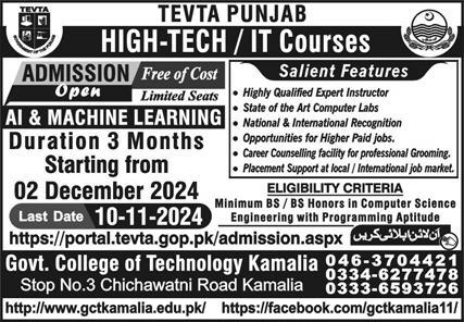 TEVTA Govt College of Technology Jhang AI & Machine Learning admissions 2024 has been announced. Students who want to take admissions in TEVTA Govt College of Technology Jhang Toba Tek Singh Punjab Pakistan for academic year 2024 to continue education in IT Course can apply. Students who want to enroll for academic session 2024 in Course qualification and admission criteria for Government institute can apply till last date 9 November 2024. Read newspaper ad for exact details.