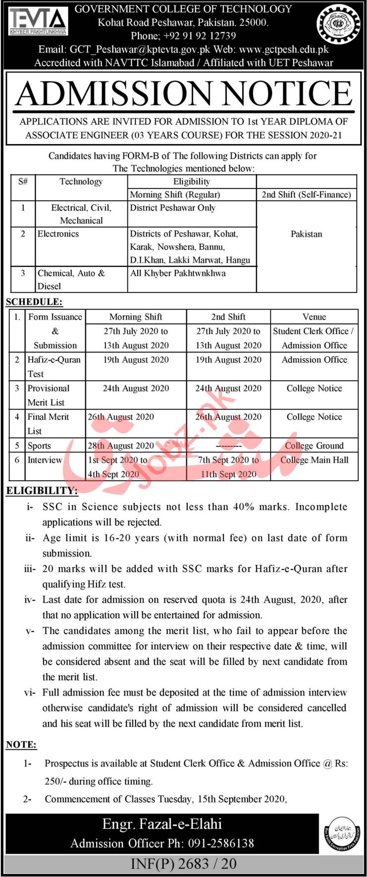 Govt College of Technology GCT Admissions 2020 for Diplomas