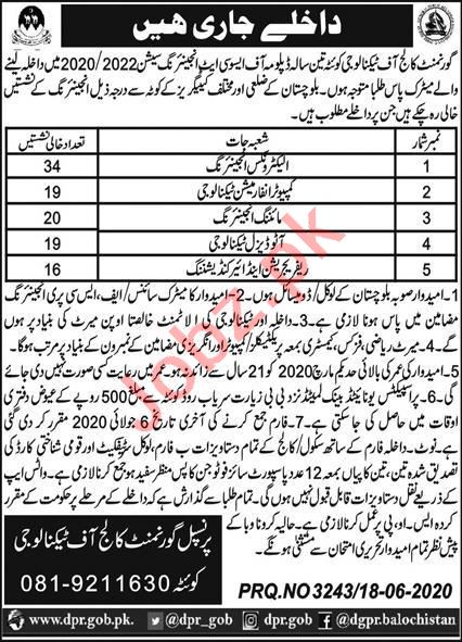Govt College of Technology Quetta Admissions 2020 for DAE
