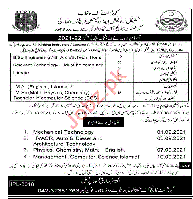 Government College of Technology Railway Road Lahore, Technical Education & Vocational Training Authority TEVTA, Government of the Punjab is seeking candidates for the posts of Visiting Teacher, Teacher, Mechanical Technology Teacher, HVAC Technology Teacher, Diesel Technology Teacher, Architecture Teacher, Electrical Technology Teacher, Lecturer, Lecturer Physics, Lecturer Chemistry, Lecturer Math, Lecturer English, Lecturer Islamiat, Lecturer Computer Science.