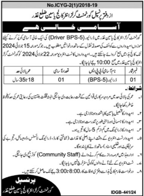Govt Girls Inter College Yasin Ghizer, Gilgit Baltistan Pakistan invites applications from eligible candidates for the post of driver as per advertisement of June 27, 2024 published in daily Ausaf Newspaper. Educational qualifications required Middle and Primary etc.