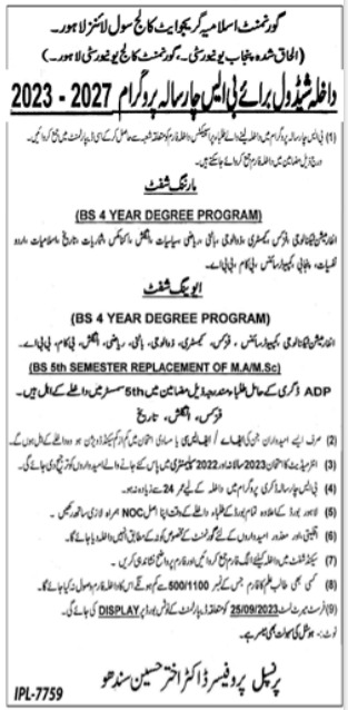 Admissions in Govt Islamia Graduate College 2023 for BS Program has been announced. Eligible students can apply for academic admissions 2023 in Govt Islamia Graduate College Lahore Punjab Pakistan for Science College. Students for admissions in Bachelor and BS & criteria can apply as per Government institute admission policy 2023 before closing date September 26, 2023 as per advertisement. Read newspaper ad for exact details.